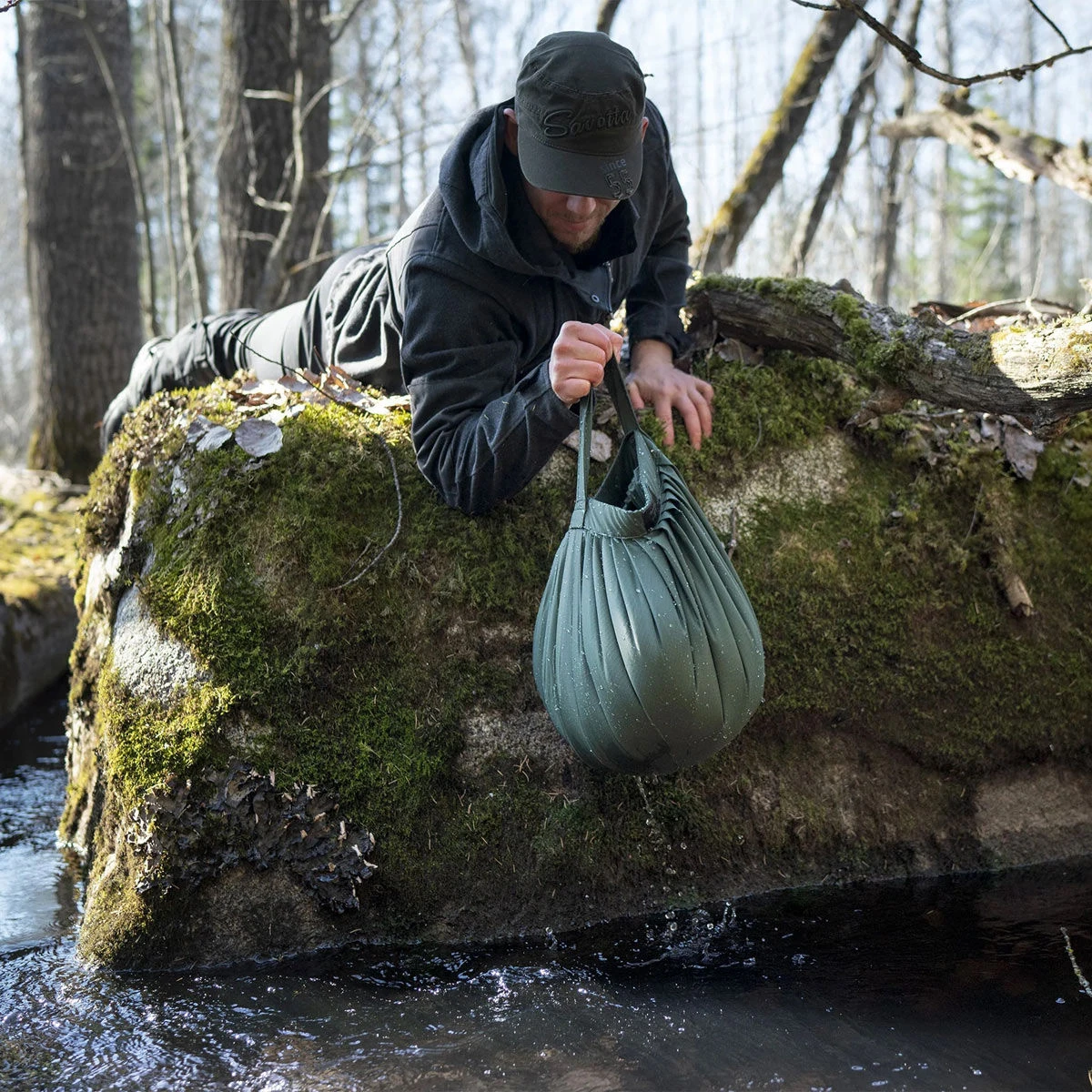 When packed the bag doesn’t take up any space at all; it fits neatly in your pocket, but when filled it can hold up to twelve litres of water.